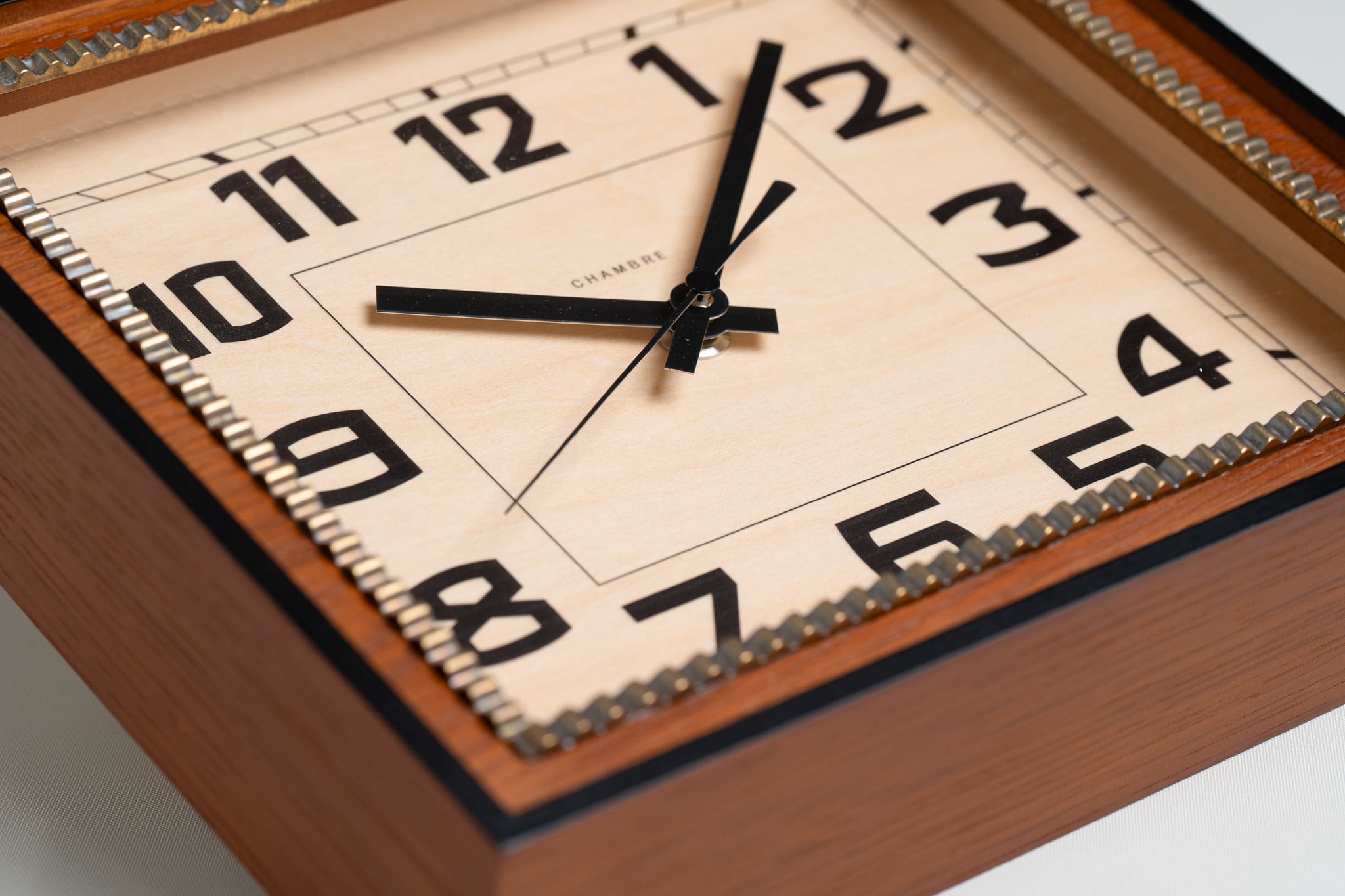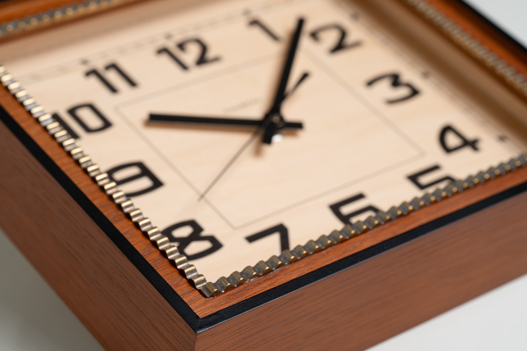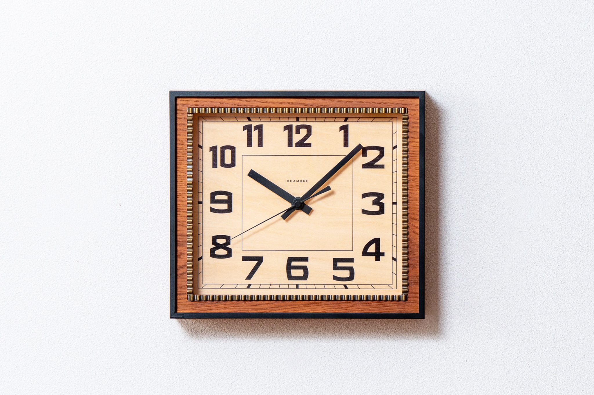 シナ文字盤とレトロなフォント、美しい木目がヴィンテージ感のある仕上がりです。