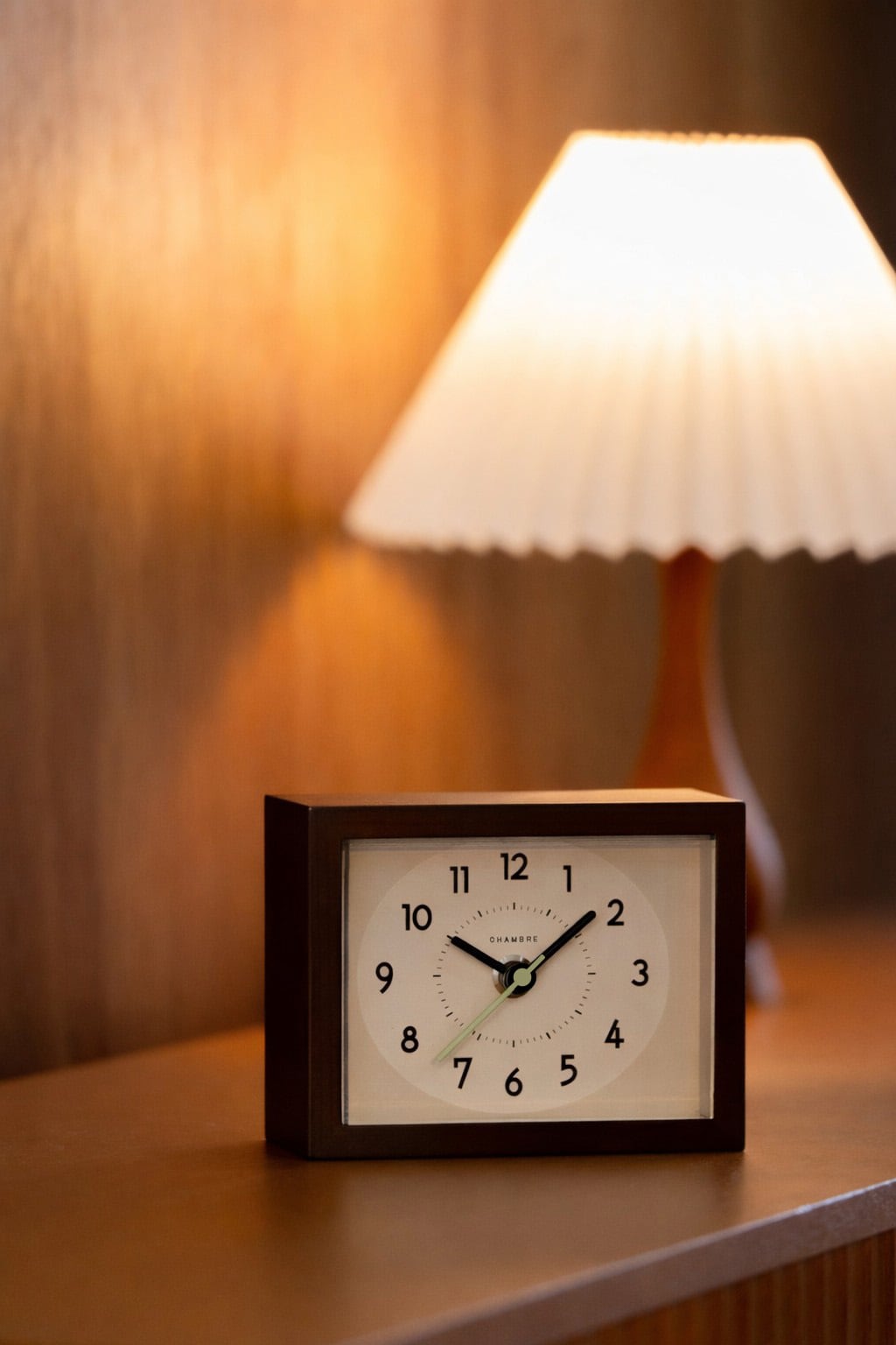 木枠にひのき無垢材を使用したレトロモダンな置き時計。