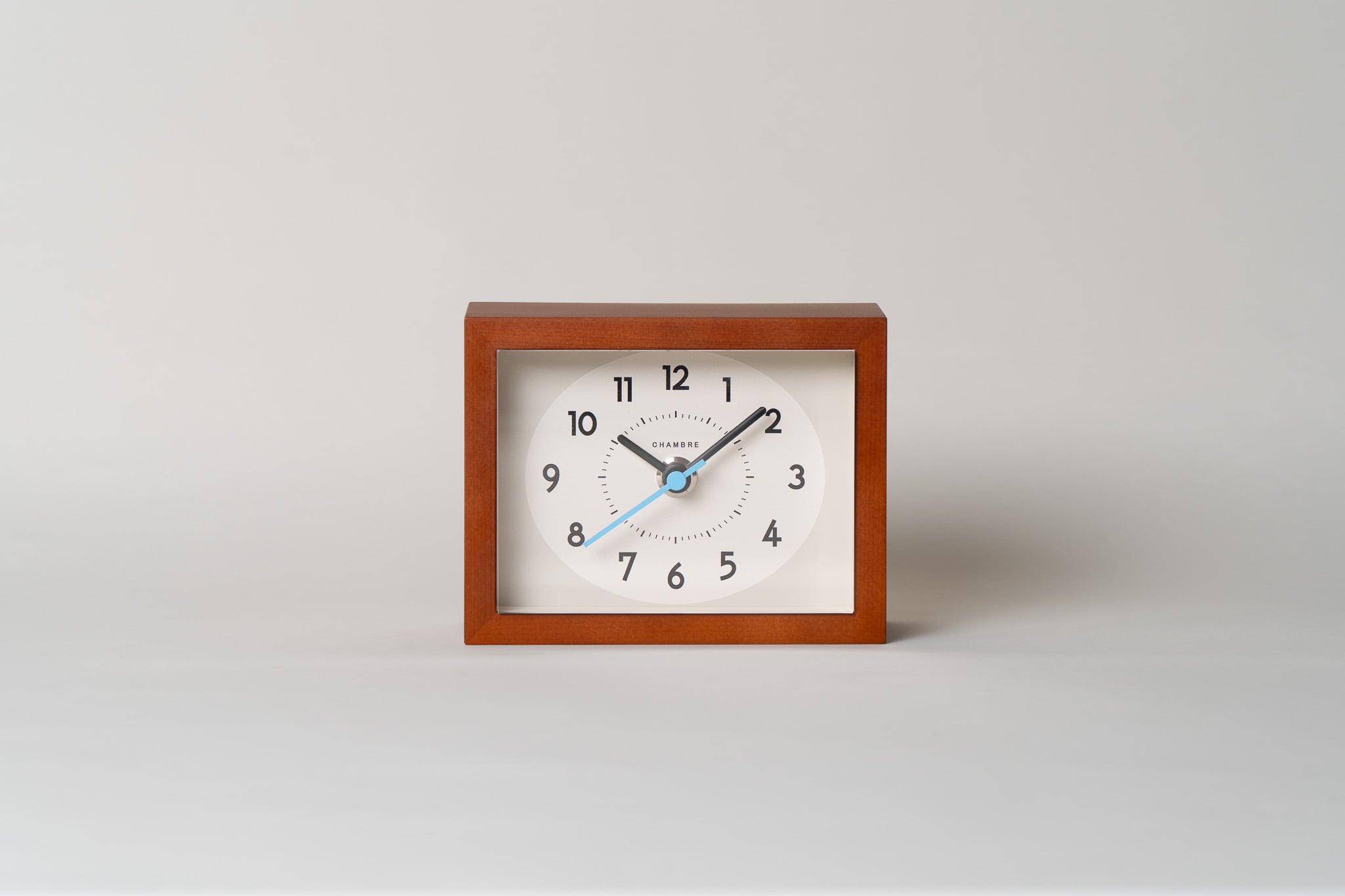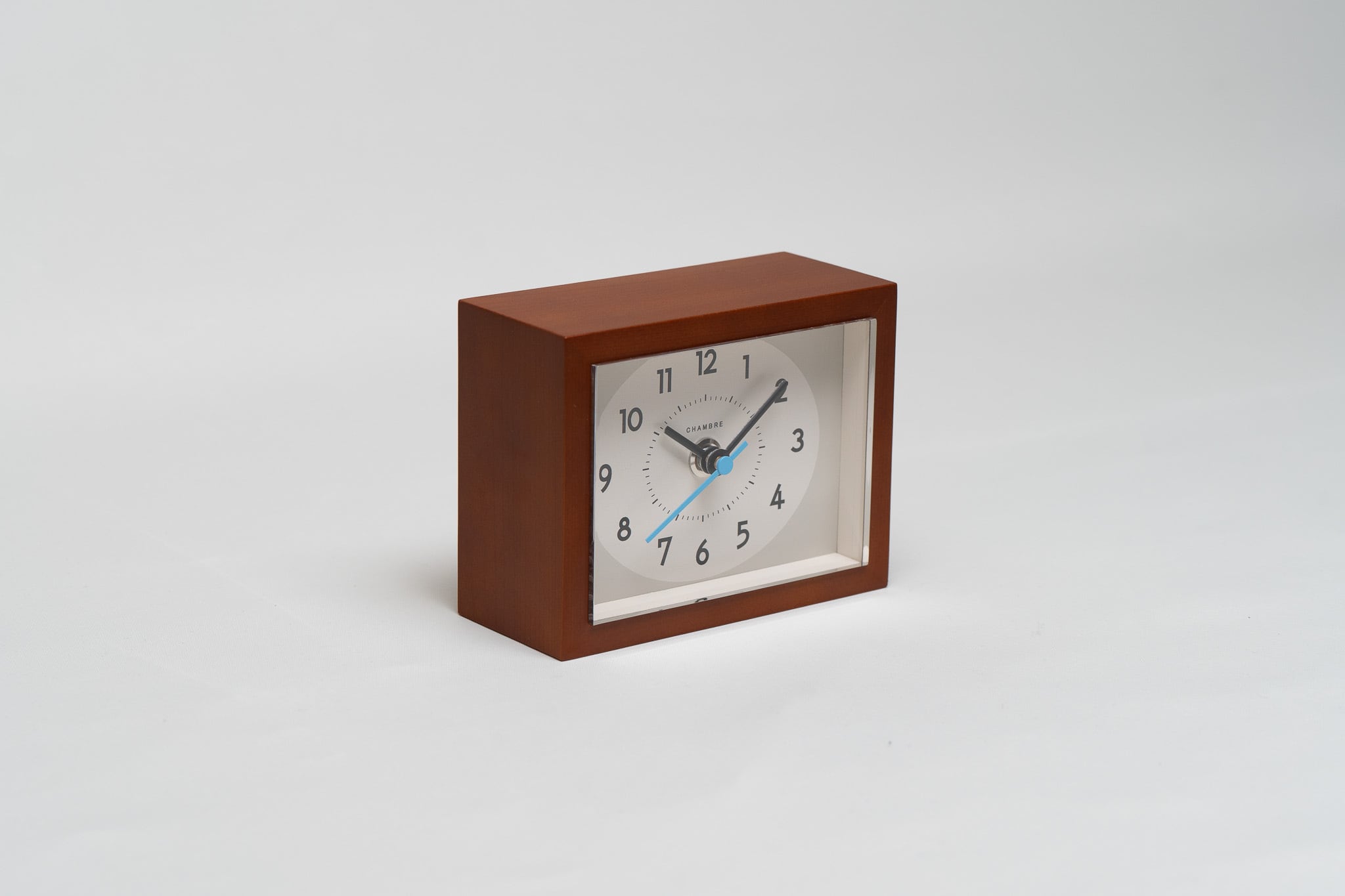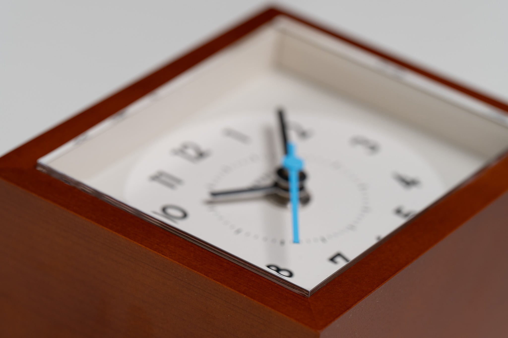 文字盤を覆うアクリルに木枠よりも厚みを持たせて突出させる設計は昭和の時代に愛された置き時計のデザインをイメージしています。